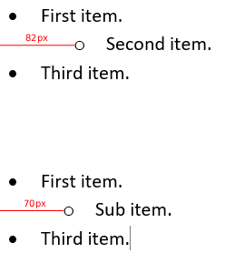 I’ve discovered another minor inconsistency with HTML imports. When importing nested lists from HTML, the style appears to differ from a regular Word list. From my limited inspection of the generated document, it seems that the nested item uses a different list style from the non-nested items, producing additional space between items and inconsistent formatting. Here is a list of the issues I’ve observed: